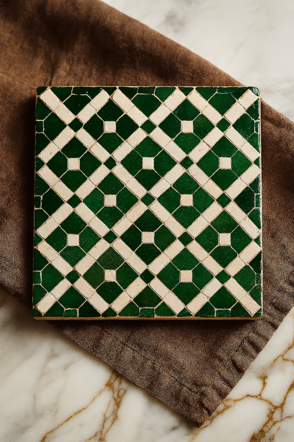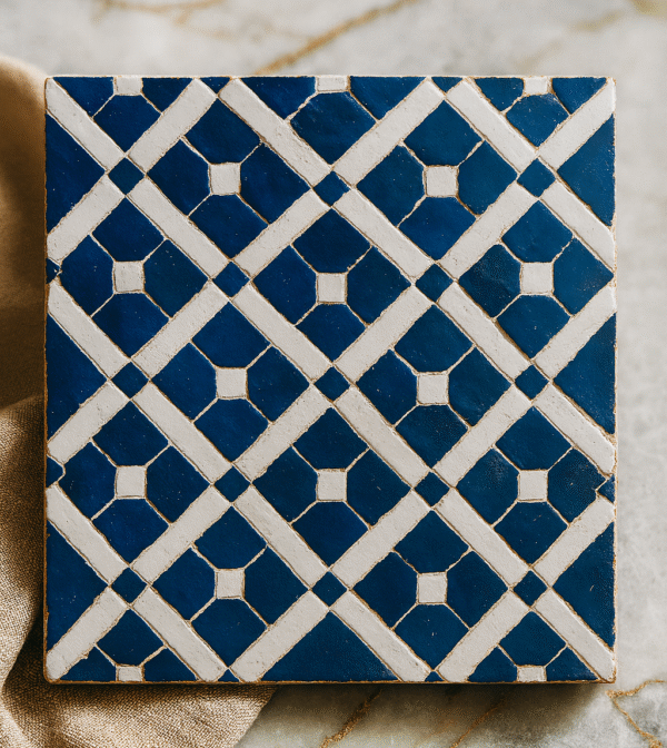Moroccan Zellij tiles are entirely handcrafted in Fès using centuries-old techniques. Each piece is hand-cut and arranged into intricate geometric patterns, offering unmatched authenticity and artistic value.
