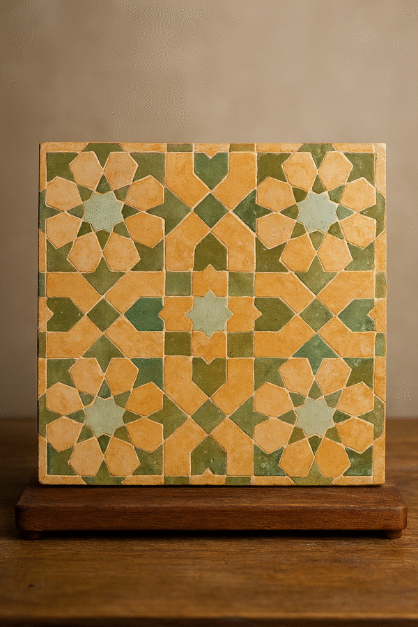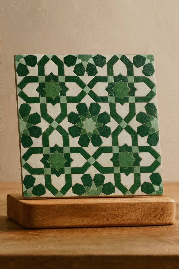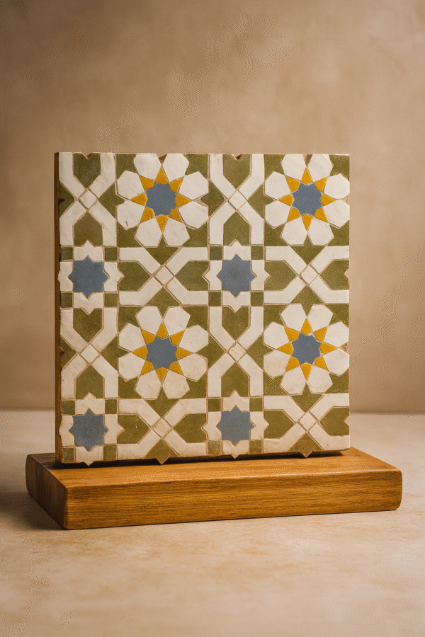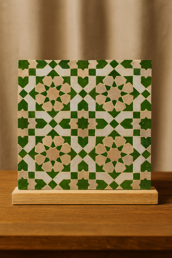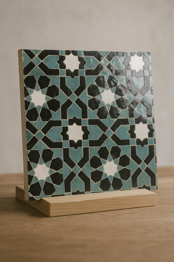 Moroccan Zellij tiles are entirely handcrafted in Fès using centuries-old techniques. Each piece is hand-cut and arranged into intricate geometric patterns, offering unmatched authenticity and artistic value.