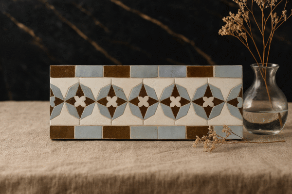 Zellij tiles are made from high-quality clay, coated with natural glazes, and finished with traditional Moroccan craftsmanship techniques.