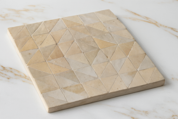 Moroccan Zellij tiles are entirely handcrafted in Fès using centuries-old techniques. Each piece is hand-cut and arranged into intricate geometric patterns, offering unmatched authenticity and artistic value.