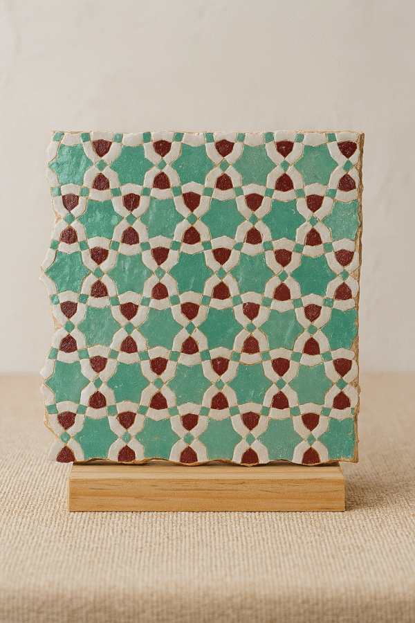 Moroccan Zellij tiles are entirely handcrafted in Fès using centuries-old techniques. Each piece is hand-cut and arranged into intricate geometric patterns, offering unmatched authenticity and artistic value.