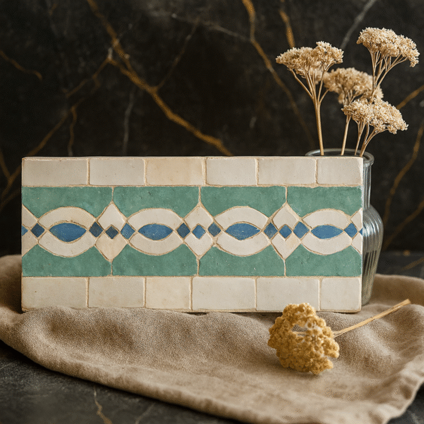 Zellij tiles are made from high-quality clay, coated with natural glazes, and finished with traditional Moroccan craftsmanship techniques.