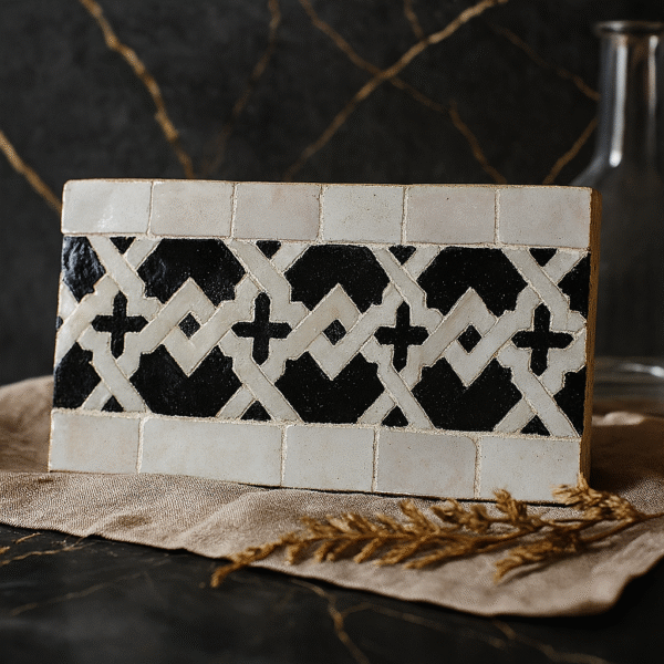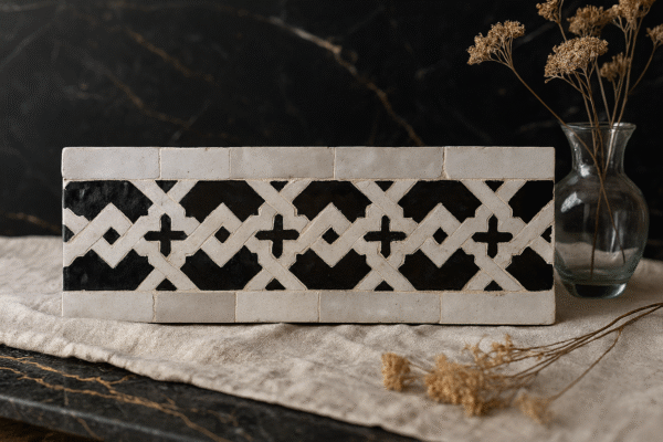 Moroccan Zellij tiles are entirely handcrafted in Fès using centuries-old techniques. Each piece is hand-cut and arranged into intricate geometric patterns, offering unmatched authenticity and artistic value.